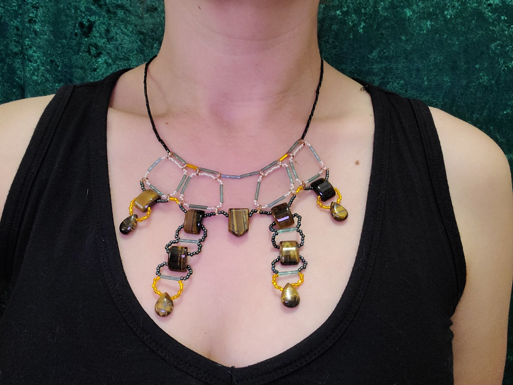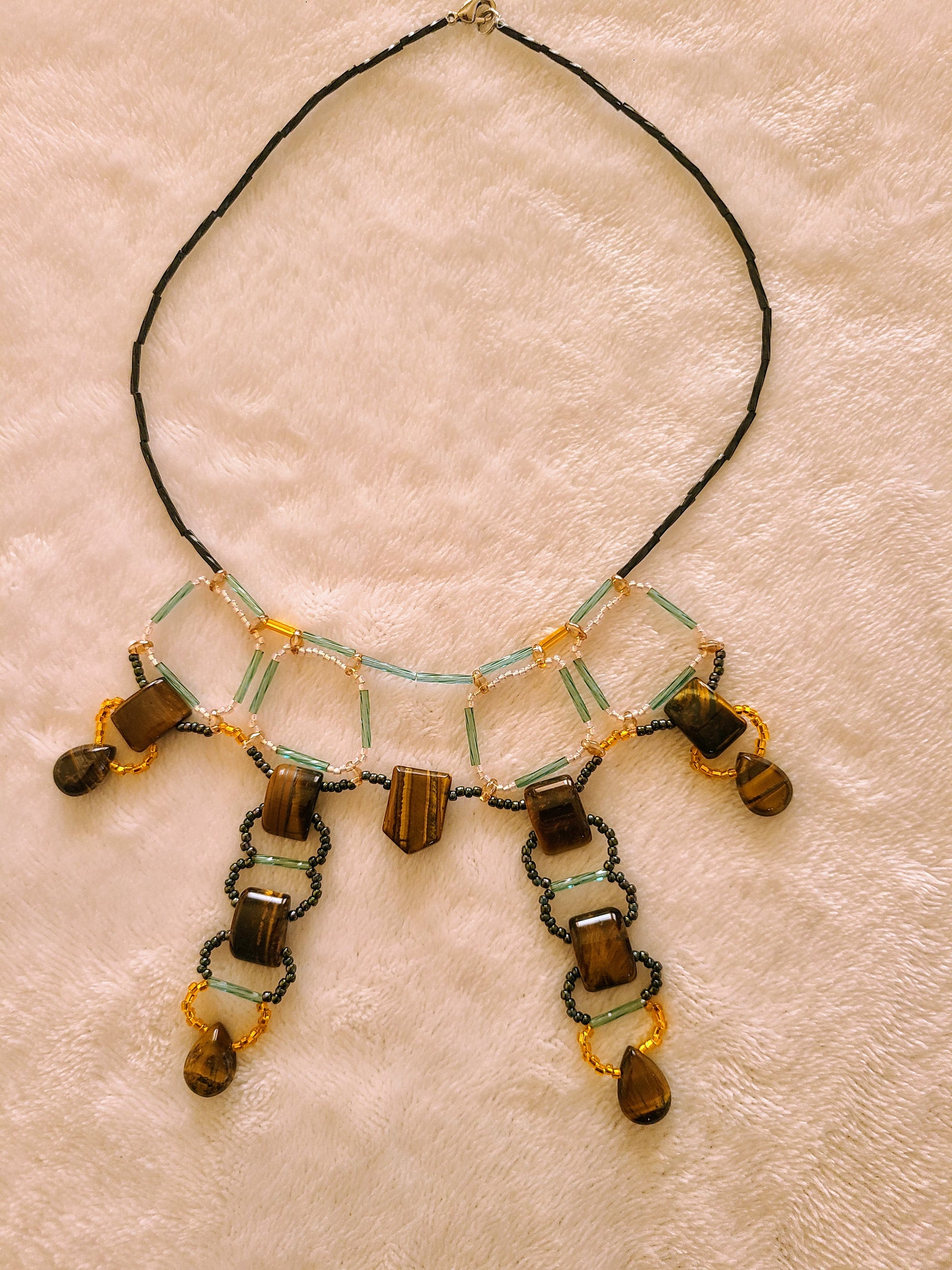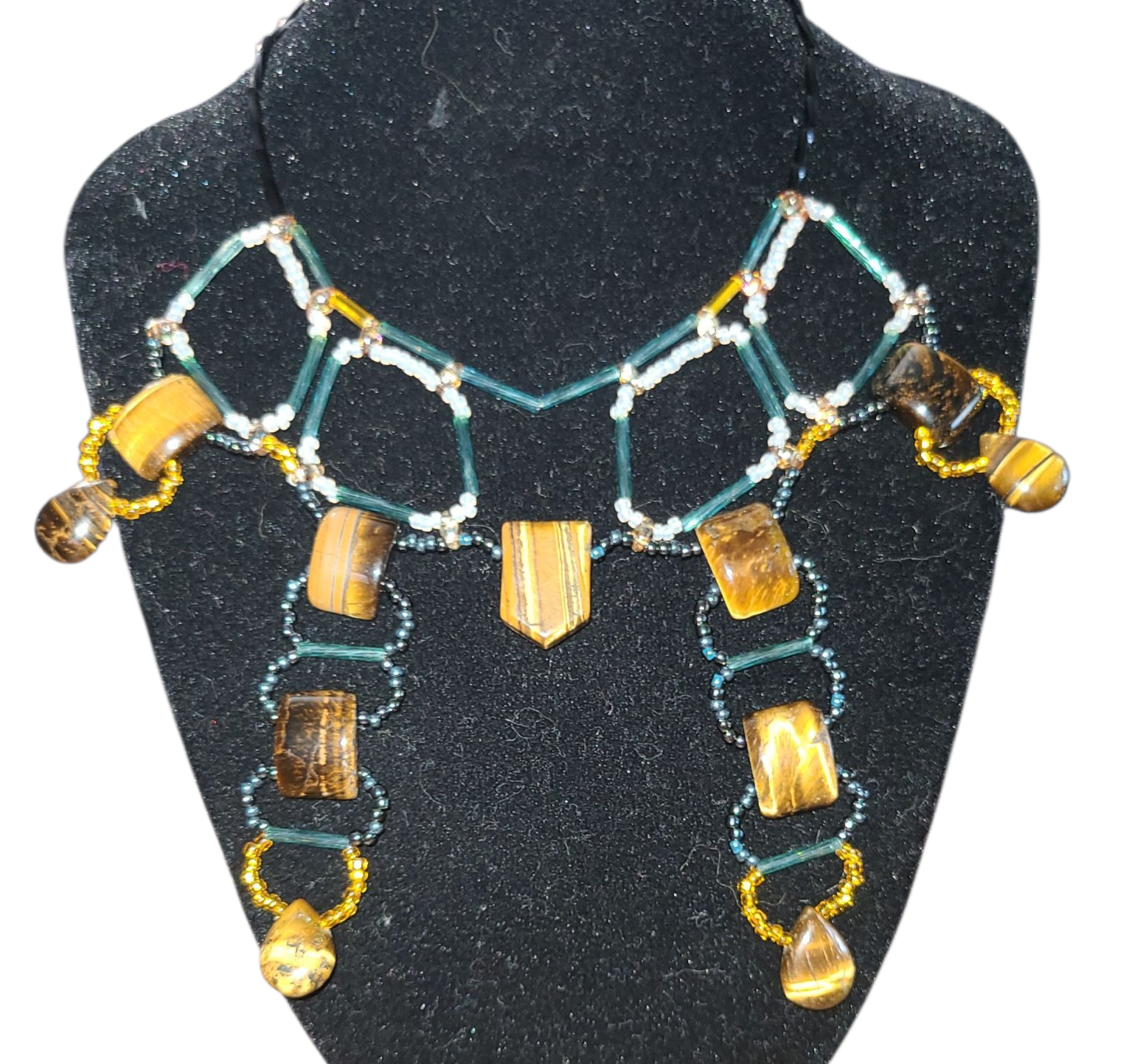 Cool teal and ivory beadwork frames warm tiger eye gemstones in this Mediterranean-inspired statement necklace. The hexagon-linked neckline flows into four front drops, each combining tiger eye rectangles with beaded connectors and smooth oval beads. Ideal for adding richness to an autumn-tone wrap dress.