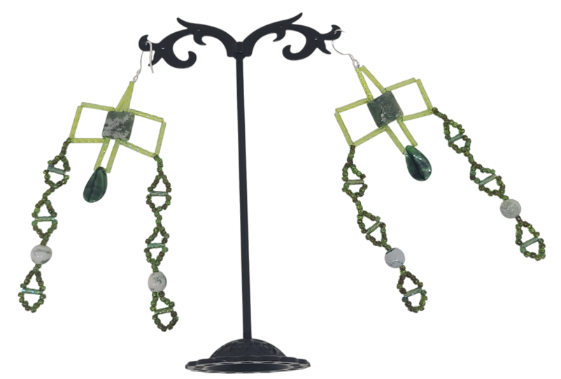 These beaded statement earrings frame square-cut tree agate with a cross-shaped design and deep green beadwork on each side. Softly symmetrical and grounded in earthy green tones, they feel calm but intentional. Style with a white button-down and olive trousers for daytime, or wear them with a flowy dress in neutral tones for something more relaxed but still put-together.