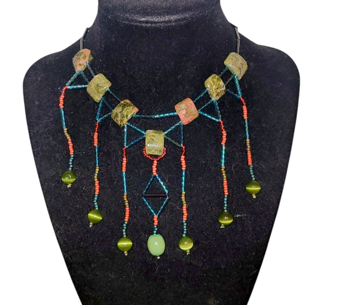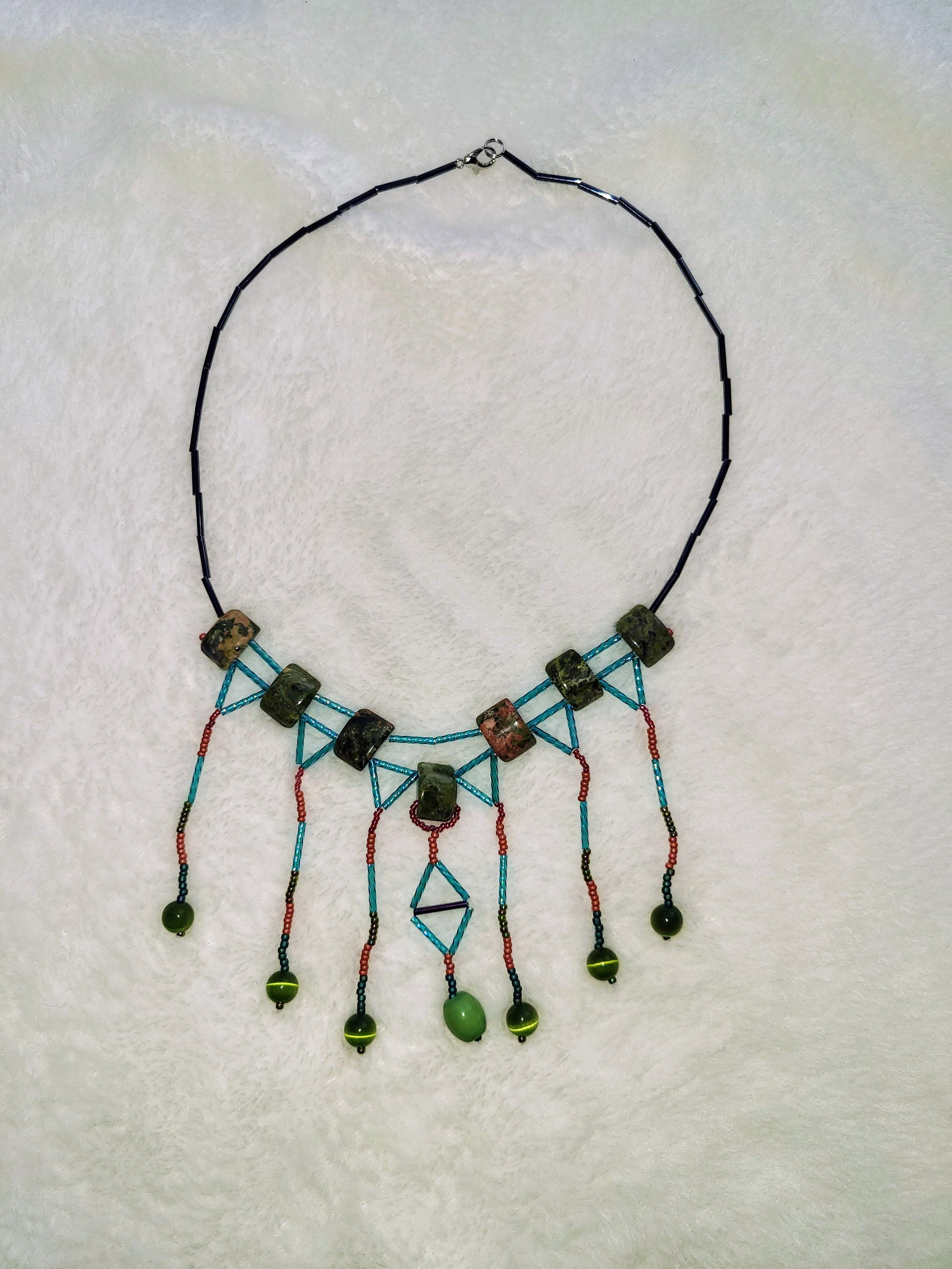 Unakite cubes, with their blend of mossy green and rust tones, form the upper row of this necklace, connected by bright turquoise beaded arches. Red and green beadwork extends downward in symmetrical strands, each finished with a smooth green accent bead. A central unakite bead anchors the design, with a geometric turquoise pendant adding a bold focal point. Pair it with a linen blouse and wide-leg pants for a refined daytime look, or a black dress to let the colors stand out. Perfect for gallery openings, cultural events, or adding a statement to everyday wear.