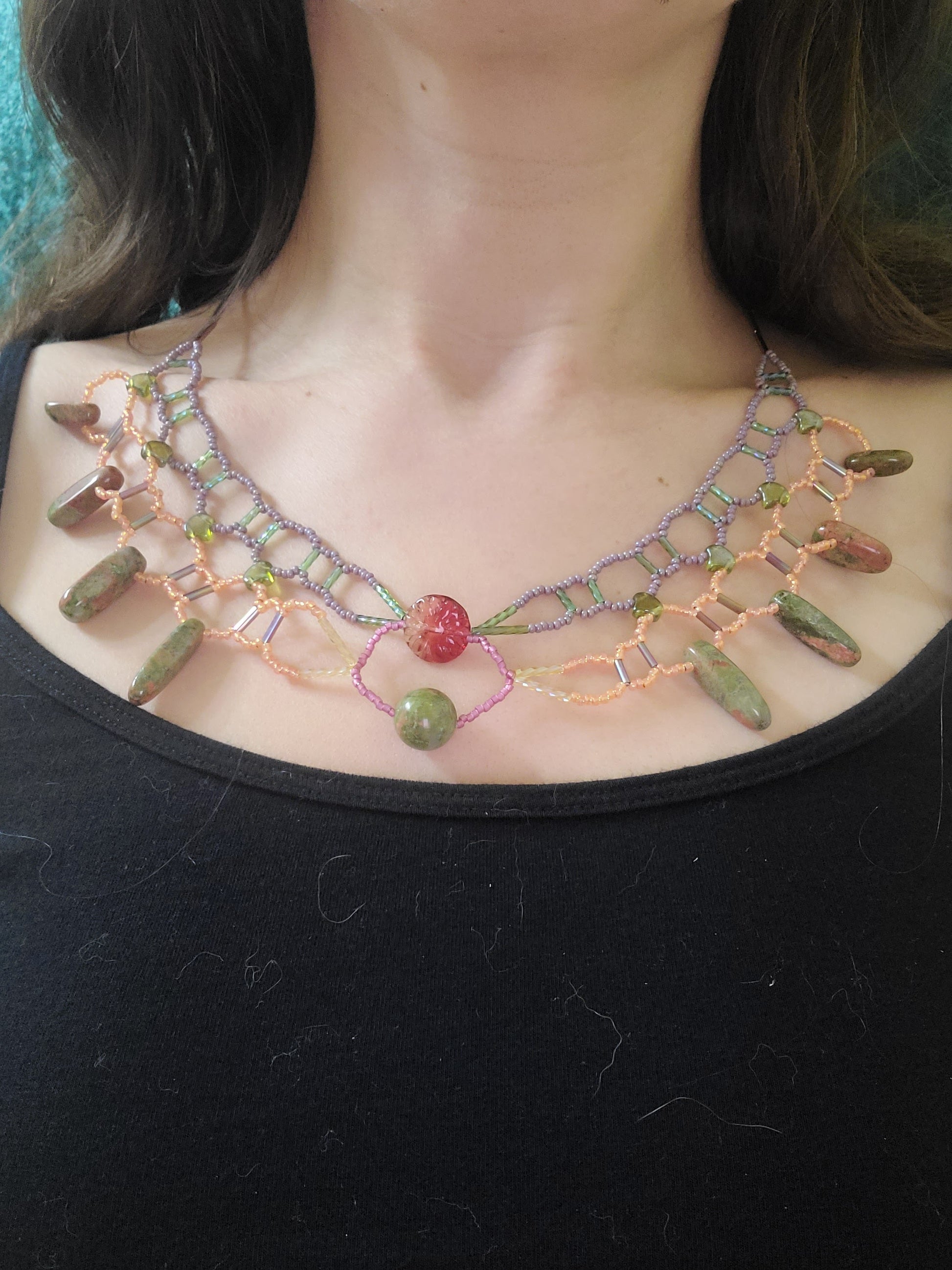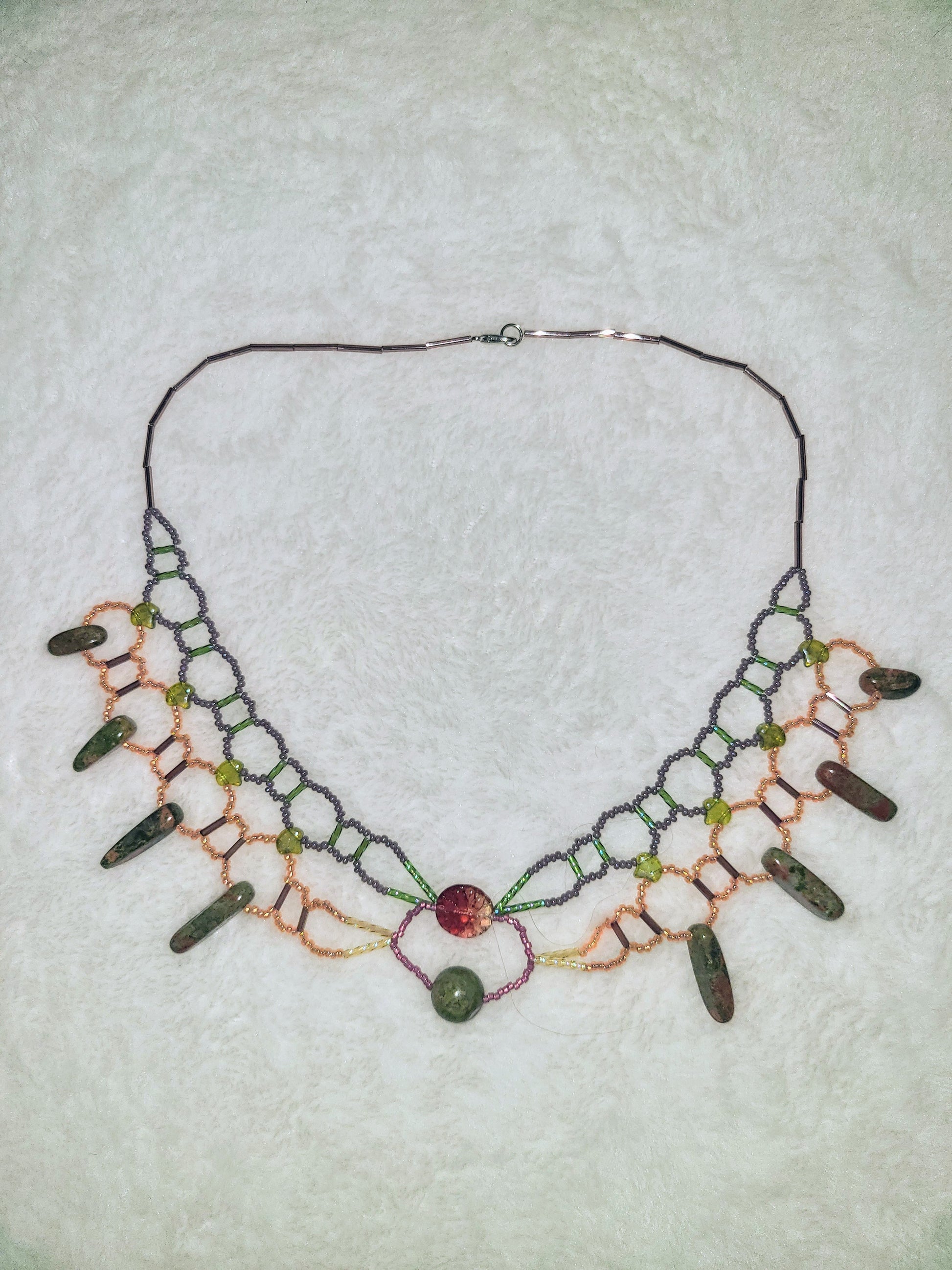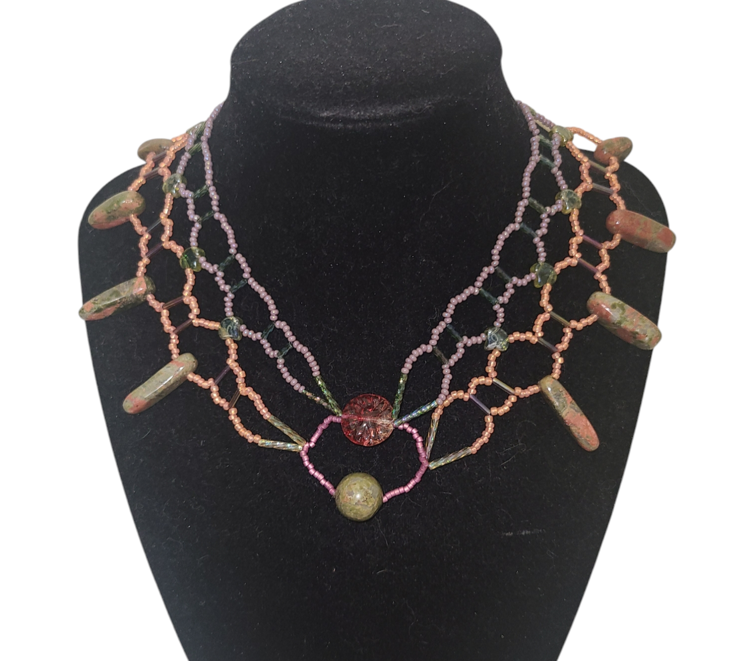 With its soft palette of peach and green, this Egyptian-inspired collar necklace brings an ancient-inspired elegance to any outfit. The multi-strand design features unakite stones arranged in an intricate double ladder beaded structure that exudes depth and visual interest. Whether styled with a relaxed linen jumpsuit or an off-the-shoulder gown, this piece makes a subtle yet striking statement.
