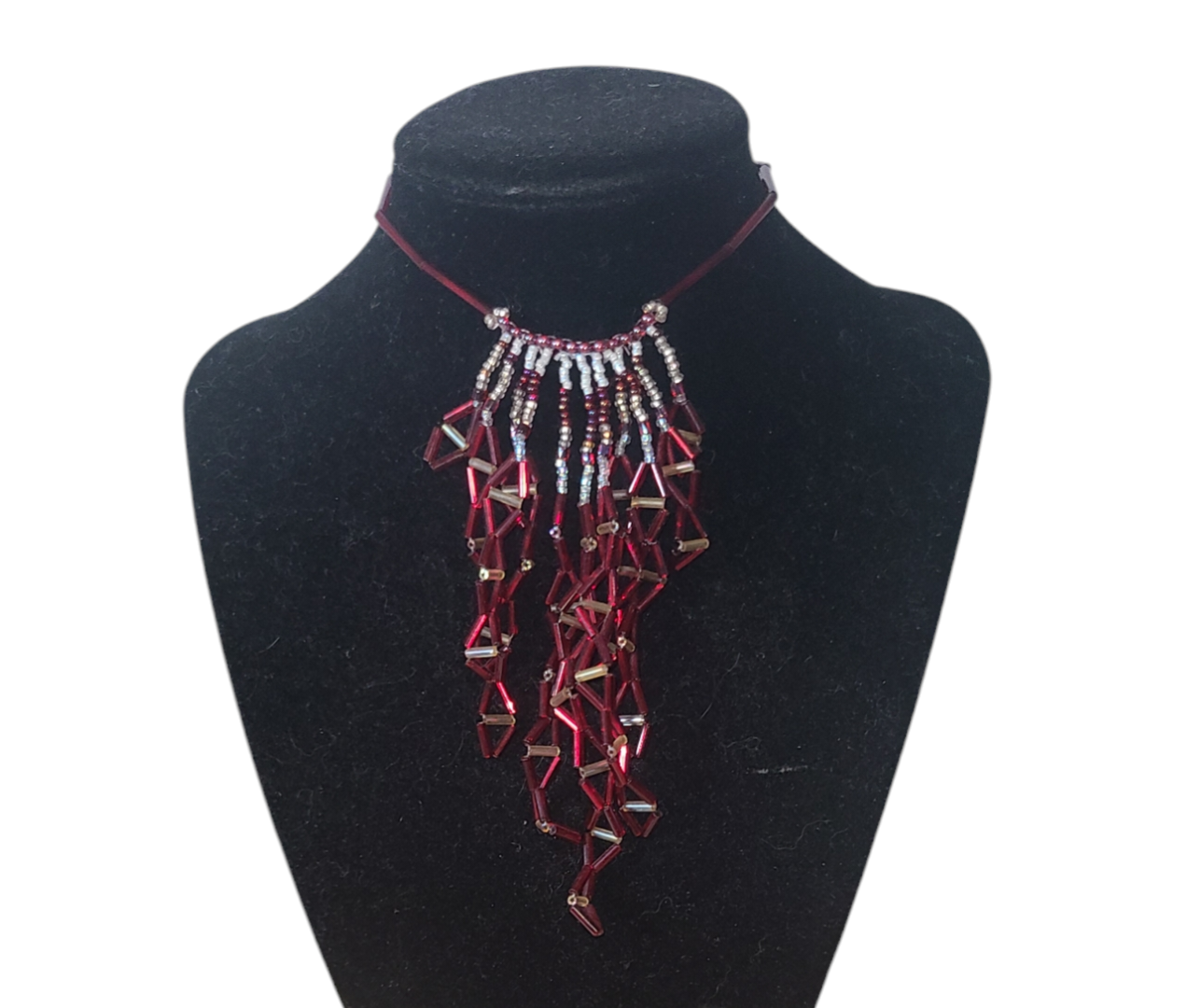This intricate necklace is a true showstopper, meticulously crafted with a cascade of hand-beaded triangles that shimmer and dance with every movement. The color palette is a sophisticated blend of wine and champagne.. The triangles come together to to create a captivating waterfall effect, adding a dramatic touch to your outfit.