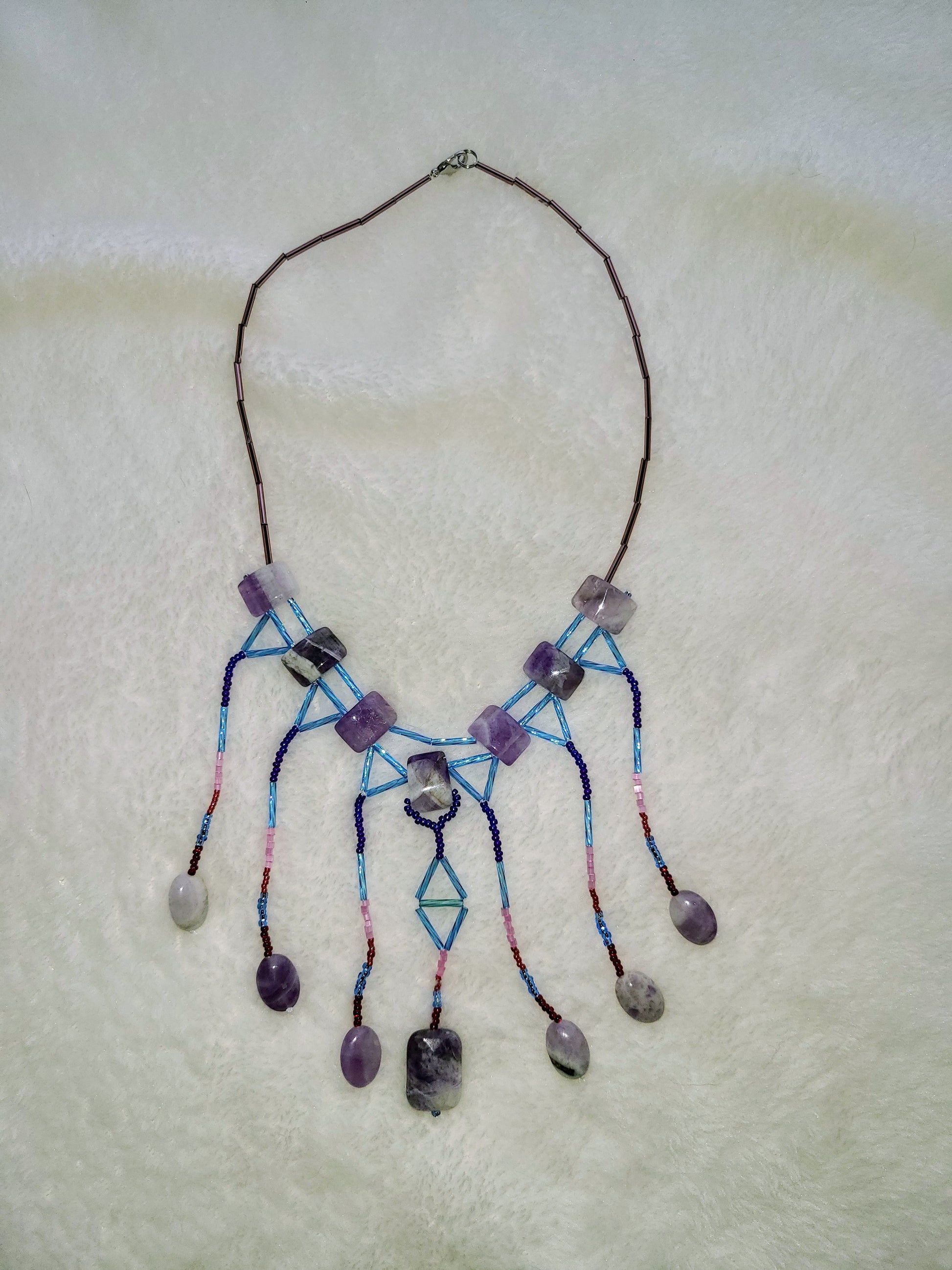 Large amethyst stones form the foundation of this design, connected by delicate beaded strands in shades of deep purple and blue. Thin cascading strands extend downward, ending in smooth amethyst drops and geometric silver-toned accents. Style it with a soft cashmere sweater or a flowing maxi dress for a wintery, ethereal vibe. Ideal for candlelit dinners or a night at the theater.