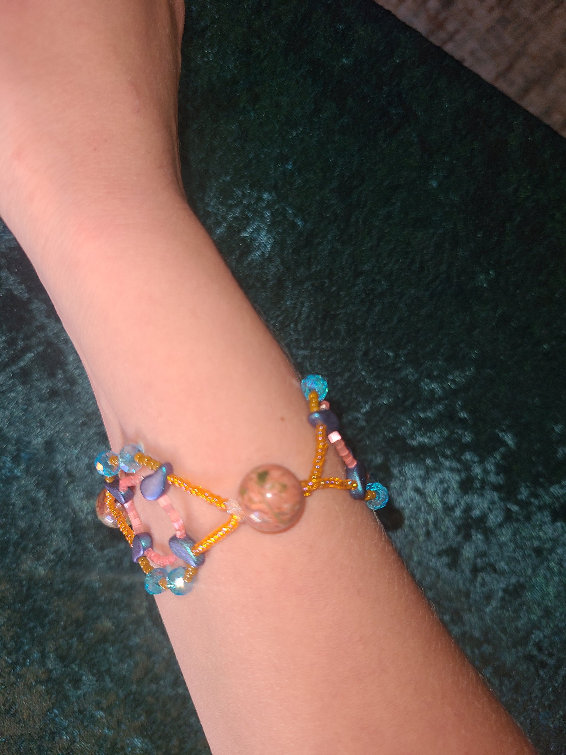 This delicate bracelet features ovals of detailed beadwork with glass accent beads, connected by unakite beads.