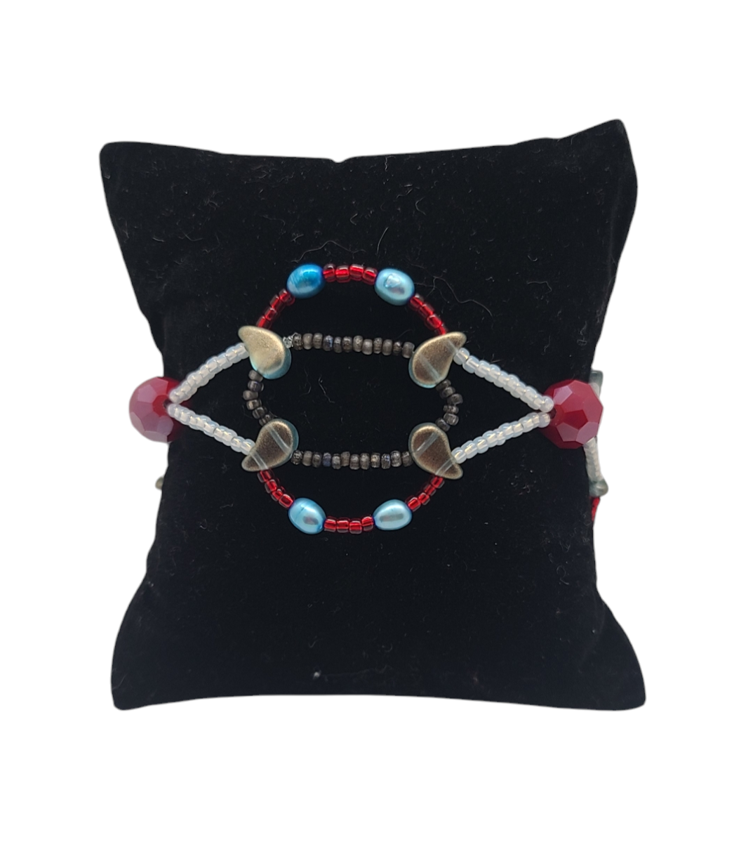 Celebrate the elegance of winter with this handcrafted bracelet inspired by the beauty of snowy landscapes. Featuring paisley-shaped beads in frosty white and icy blue, this intricate design is reminiscent of snowflakes and frost-kissed mornings. Accents of vibrant red and aquamarine add a bold touch, making it the perfect statement piece for winter fashion. Ideal for holiday parties, seasonal celebrations, or elevating casual outfits, this bracelet pairs beautifully with cozy sweaters, tailored coats, and evening dresses. Add a unique touch of wintry charm to your jewelry collection with this distinctive, cold-season-inspired accessory.